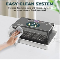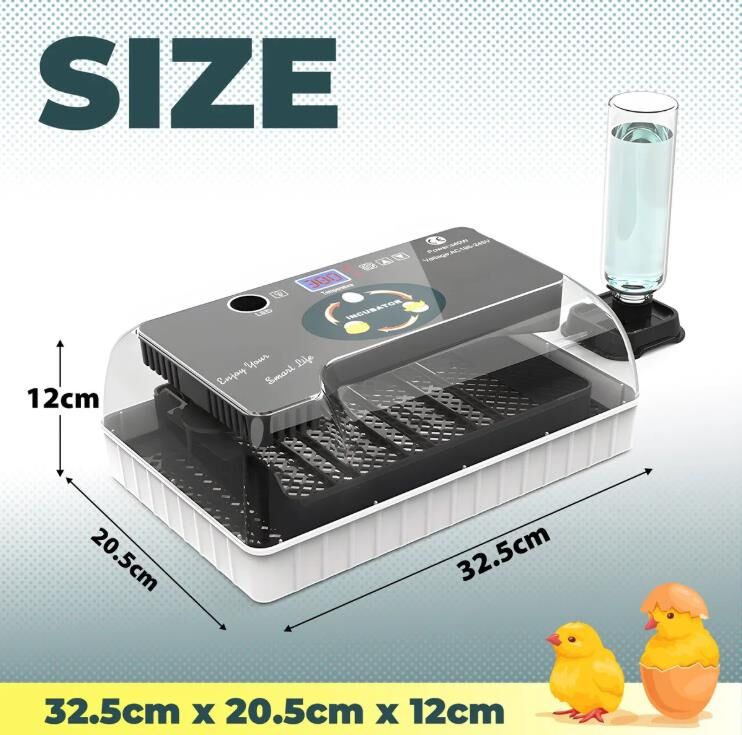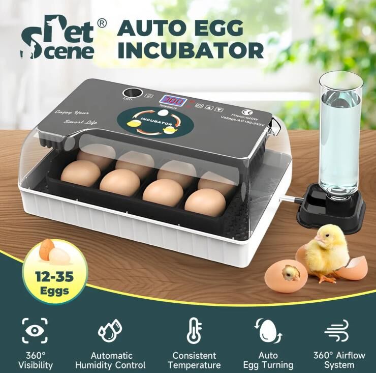Improve your hatching success and raise healthy chicks with this Automatic Digital Egg Incubator Hatcher, ideal for chickens, ducks, quails, parrots and other bird species. Featuring a patented 360° airflow system, it delivers high hatch rates, fitting 12 larger or 35 smaller ones. Moreover, the advanced humidity control system with one auto-refill water bottle and an air vent offers stable and precise conditions, all monitored via a digital display and clear viewing lid. Besides, this chicken egg incubator turns eggs every two hours for consistent heating and optimal embryo development, supported by an integrated fan for even heat distribution. Even better, you can track embryo progress with a built-in egg candler and enjoy easy maintenance with detachable trays and wipeable surfaces. Versatile and practical, this automatic egg incubator is perfect for farms, homes, labs and educational settings, fully catering for your hatching needs.