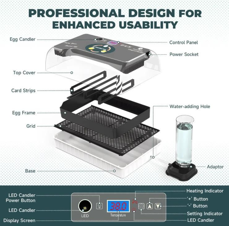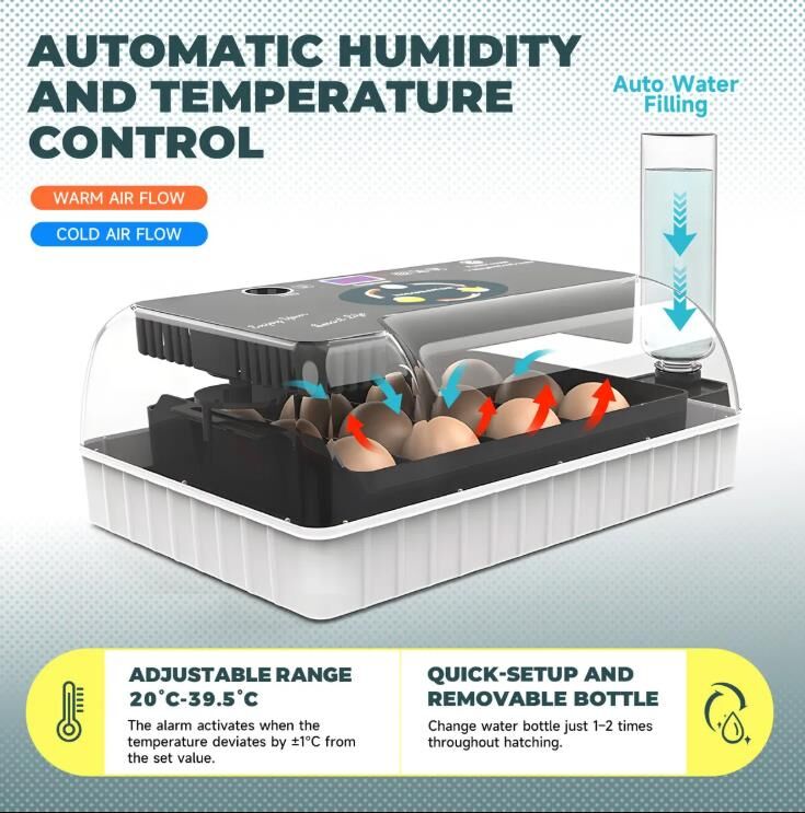 - Consistent Humidity & Auto Egg Turning: A single water bottle is used to maintain stable humidity without needing to open the incubator. It automatically turns the eggs every two hours to promote uniform development; remember to remove the turner during the last three days to ensure successful hatching.