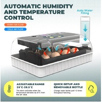 - Automatic Humidity and Temperature Control: This incubator automatically maintains your set humidity and temperature levels. It includes adjustable vents, a digital display for precise monitoring, an integrated fan to ensure even heat distribution, and an automatic temperature alarm to alert you of any deviations.