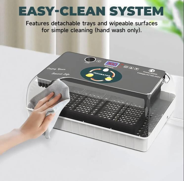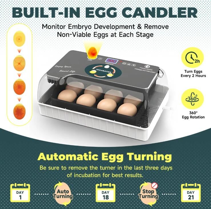 - Clear Monitoring & Easy Cleaning: The incubator provides 360° visibility and comes with a built-in egg candler for tracking embryo development throughout the 21-day cycle. It features detachable trays and wipeable surfaces for straightforward cleaning (hand wash only).