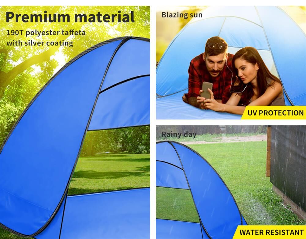 Waste lots of time in set up a tent rather than trip. Mountview Pop Up Tent solves this problem, setup in seconds, no assembly required. Adopt special silver coated fabric effective in UV protection. Features interwoven mesh, breathable and upscale appearance. In addition, 6 ground stakes ensure tent stable and firm, withstand breezy condition perfectly. Better still, a carry bag for easy carrying and store, taking everywhere you want, such as park, beach, and etc. Enjoy your trip time.