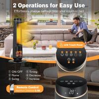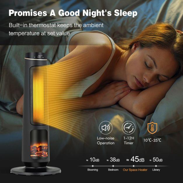 With the built-in handle, this space heater is easy to place wherever you want. After that, the sensitive touch panel and full-featured remote control make the operation easier. You can set the timer up to 12H and adjust the temperature from 10℃ to 35℃. According to your heating needs, there are 2 heat settings (2500W/1400W) for you to choose from. And the advanced PTC ceramic heating elements endow fast and efficient heating to get rid of the cold quickly. Then, the 80° oscillation delivers cozy warmth to people at different angles. What’s more, the thermostat gives you endless warmth while saving your energy cost. During the heating of the whole night, the tip-over and overheating protections ensure safety. In addition, this space heater serves as a cooling fan as well, allowing you to use it in the hot summer. And the 3D realistic flame effect can be operated separately for all-year-round use.