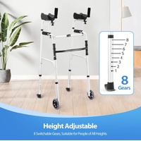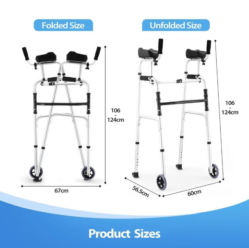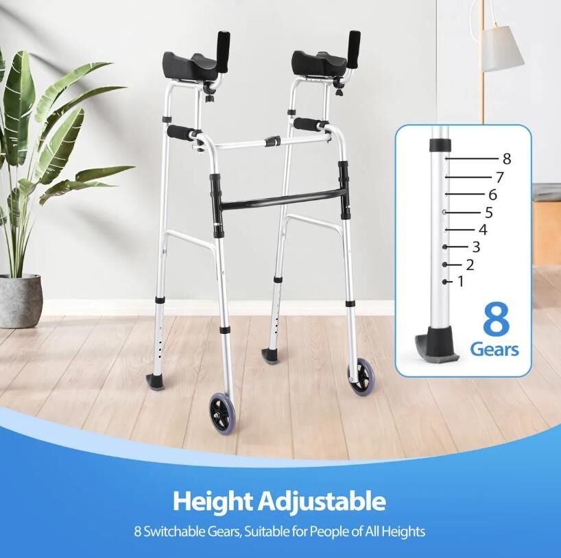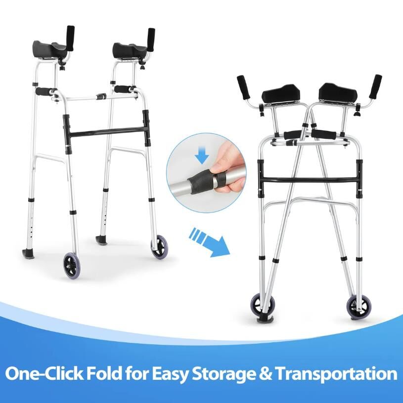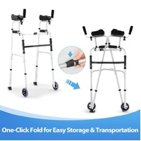 Not only does this 2-in-1 folding walker provide versatile support for those with limited mobility, but it also improves their mobility and independence. This multifunctional walker can serve as a walking aid, a stand-up aid, a toilet safety rail, and more. The soft PU armrests are skin-friendly and adjustable in four different lengths to suit individual needs. The height of the walker is easily adjustable from 106 to 124 cm to suit users of different heights. Equipped with durable wheels, it ensures smooth movement across various terrains. Featuring a user-friendly one-click design, this walking frame is easy to fold and store. Its sturdy aluminum construction can support up to 150kg, ensuring durability and stability. Navigate your home or explore the outdoors with confidence with this walker mobility equipment.