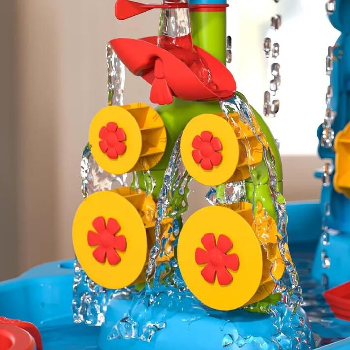 - Comes with colorful beach and water toys, including a dolphin funnel, water windmill, tree water tower, boat, and more.