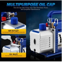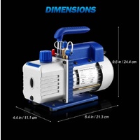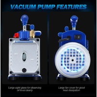 Streamline refrigeration and packaging efforts with our Single Stage 3CFM Vacuum Pump, a high-performance solution tackling various applications. Crafted with a lightweight cast aluminium construction, it boasts maximum durability while remaining highly portable. Its direct-driven and all-copper motor ensures effortless start-up, while the built-in cooling fan and aluminium alloy casing work in tandem to protect the motor thermally and dissipate heat effectively. Additionally, the brass-fitted tethered safety caps prevent oil leaks for a safe operation. Ergonomically designed with a premium grip handle, this refrigerant vacuum pump promises comfort and mobility, allowing for convenient carrying wherever needed. Even better, it features a backflow prevention technology to avoid chamber contamination for optimal performance and longevity. Versatile for commercial and household uses, the refrigeration vacuum pump is suitable for air conditioner cleaning, vehicle maintenance, vacuum packaging, refrigerator vacuuming, tackling industrial tasks, etc.