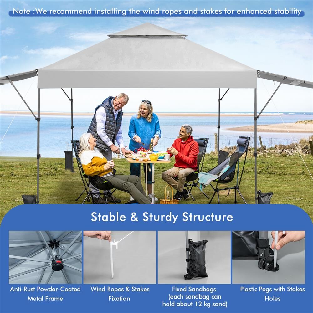 Stable & Sturdy Structure: The supporting frame is constructed of high-strength powder-coated metal, which is not easy to rust, peel, or chip, ensuring good sturdiness. Moreover, it is equipped with wind ropes, stakes, plastic pegs, stake holes, and fixed sandbags for firmly fixing the canopy on the ground, enhancing wind resistance.