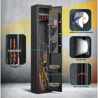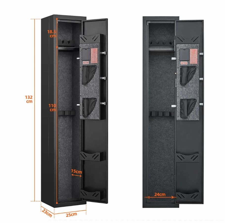 Reinforce the protection of your firearms with this Steel Gun Safe Box Case Cabinet Holder Locker. Boasting a spacious interior with dimensions of 132x25x23cm, it accommodates 4 rifles and 6 pistols, making your firearms neatly organised and easily accessible. Crafted with 1.1mm thick wall and door plates, our gun holder is designed to withstand even the most determined attempts at unauthorised access. Unlock the safe effortlessly by using the intelligent 3- to 12-digit code system, or opt for the emergency key or the USB Type-C cable with a password backup option. Further, the automatic LED light illuminates the interior, ensuring visibility and convenience. Other highlights include the dual alarm system and optional silent mode, further enhancing security and practicality. Maximise organisation with the removable shelf and removable gun racks, allowing you to customise the layout to suit your specific needs.
