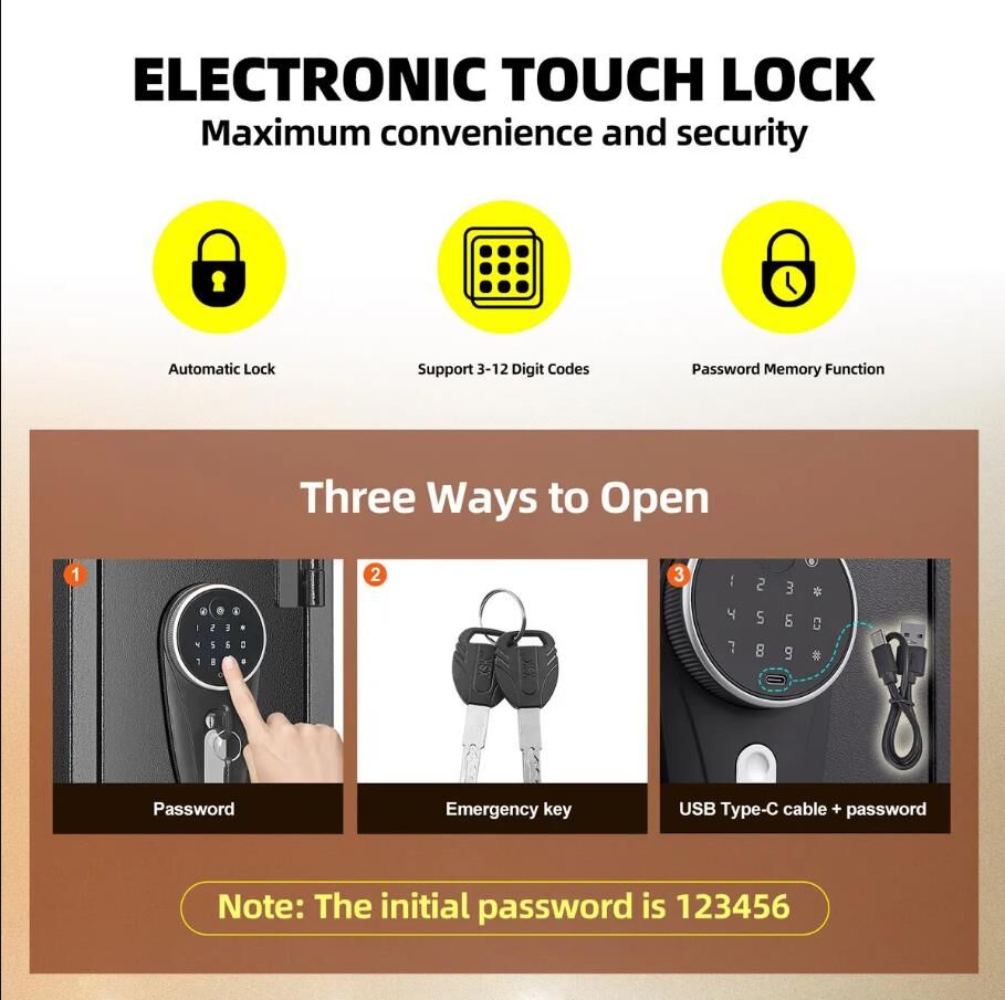 - Three ways to open: password, emergency key, and USB Type-C cable+password