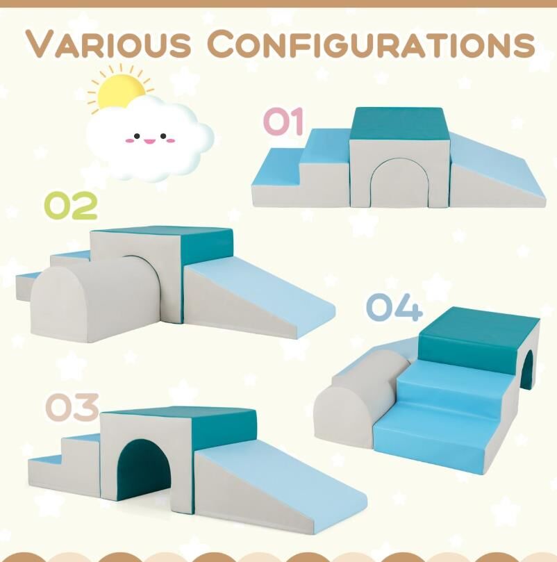 4-Piece Foam Blocks Set: This lightweight and portable soft play set consists of a tunnel, slide, step and half-moon, offering endless fun. This soft play set encourages kids to create new shapes and structures, ideal for indoor use in homes, daycare centers, and schools.