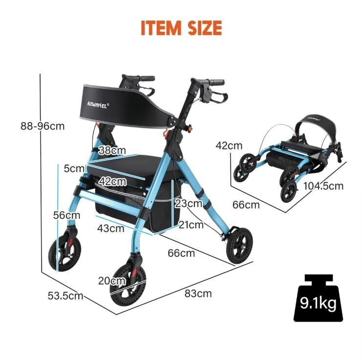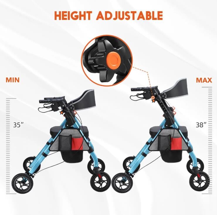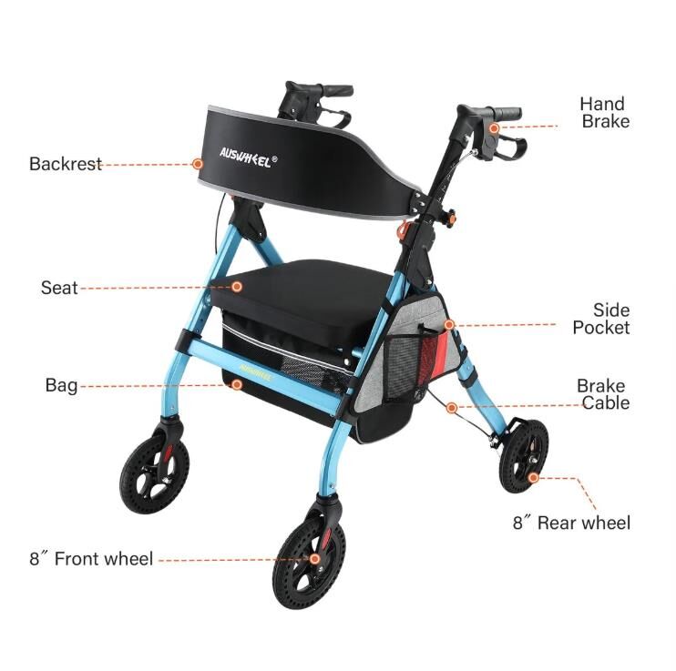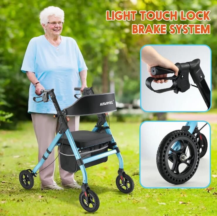 Improve balance and stability for those with limited mobility by using this 4-wheel Rollator Walker Rolling Walking Trolley. Featuring a robust aluminum frame, our rollator is sturdy, durable, and stable for a large load-bearing capacity. Reinforced with baked paint, it is rust-resistant, waterproof, and anti-wear for outdoor occasions. What’s more, four nylon wheels can roll smoothly and withstand tough use. Adopting hot-melt technology, the seat is firm and comfortable to sit on if you are tired. For extra safety, this seat walker adopts the upward convex process on the connectors of its leg pipes, which can prevent accidents caused by excessive downward pressure. With an Oxford cloth bag and side bag, this wheeled walker is folding and lightweight for easy portability and minimal storage.