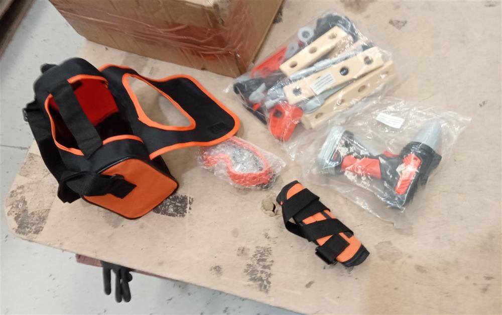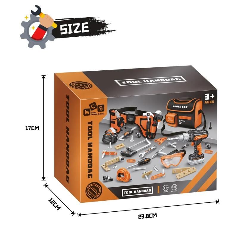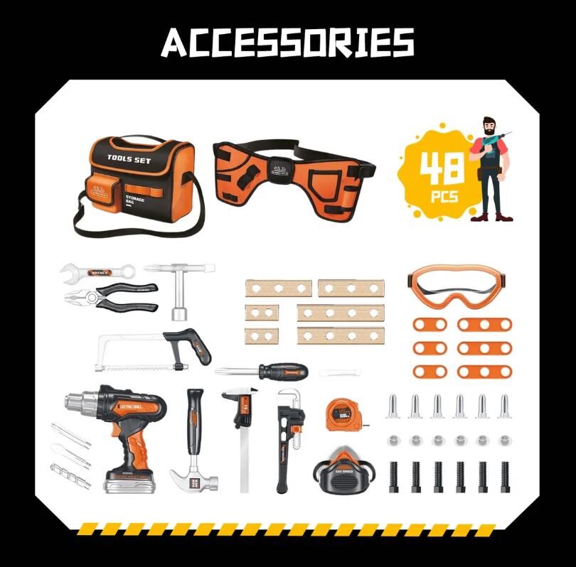 - Includes realistic tools like an electric drill, safety goggles, hammer, saw, screwdriver, pliers, wrench, and more