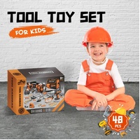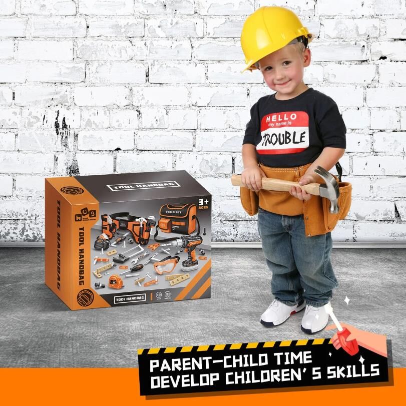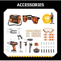 Introduce our Kids 48pcs Tool Set, an ideal educational construction playset designed to inspire creativity and develop skills in young builders. Made from child-safe, non-toxic, and BPA-free plastic, this construction toy set ensures the highest standards of safety, carrying the EN71 European Safety of Toys Certification. It includes a handy tool bag, perfect for easy storage and transport, allowing your children to take their toolkit wherever they go. This toy tool set comes with a wide variety of realistic-looking tools, providing a true-to-life role-playing experience. Among the extensive assortment, you'll find an electric drill, safety goggles, hammer, bolts, nuts, nails, saw, screwdriver, and more. Designed for children aged 3 and up, this comprehensive toolset ensures hours of imaginative play, while teaching valuable skills in building and repairing.