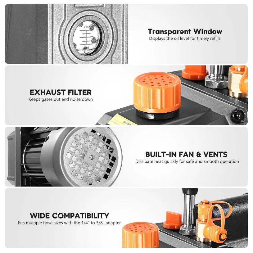 - Ergonomic Grip Handle: The ergonomic grip handle is designed for enhanced comfort and portability. With the convenient handle, you can easily carry the vacuum pump to its destination.