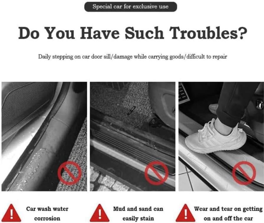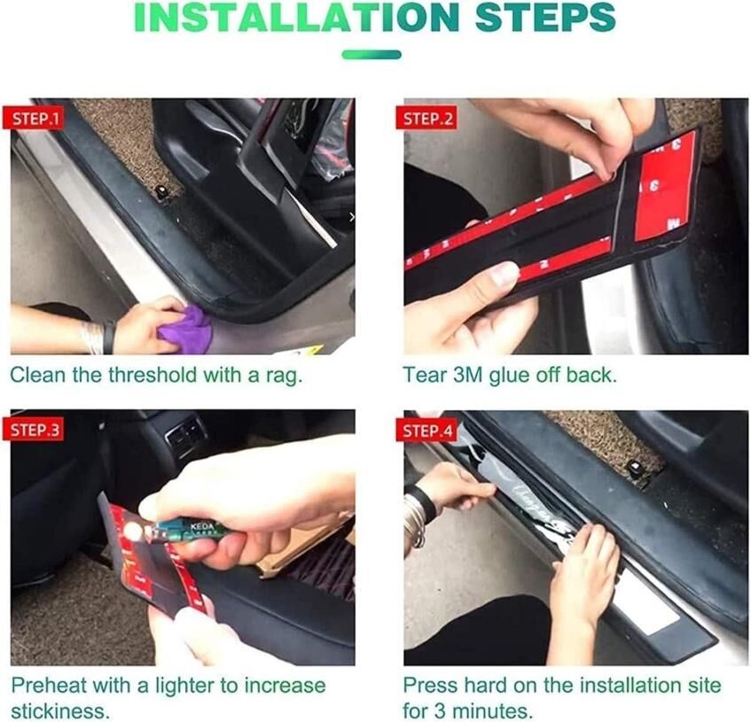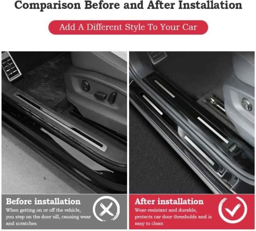 - 3. High-Quality Material: Door sill scuff protector adopts stainless steel material that is dirt&wear resistant to protect your car door frame.No worrying about car paint scratches anymore!