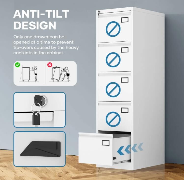 - Secure and Anti-tilt Design: The cabinet features a secure central locking system and an anti-tilt interlocking mechanism that allows only one drawer to open at a time, ensuring safety and stability.