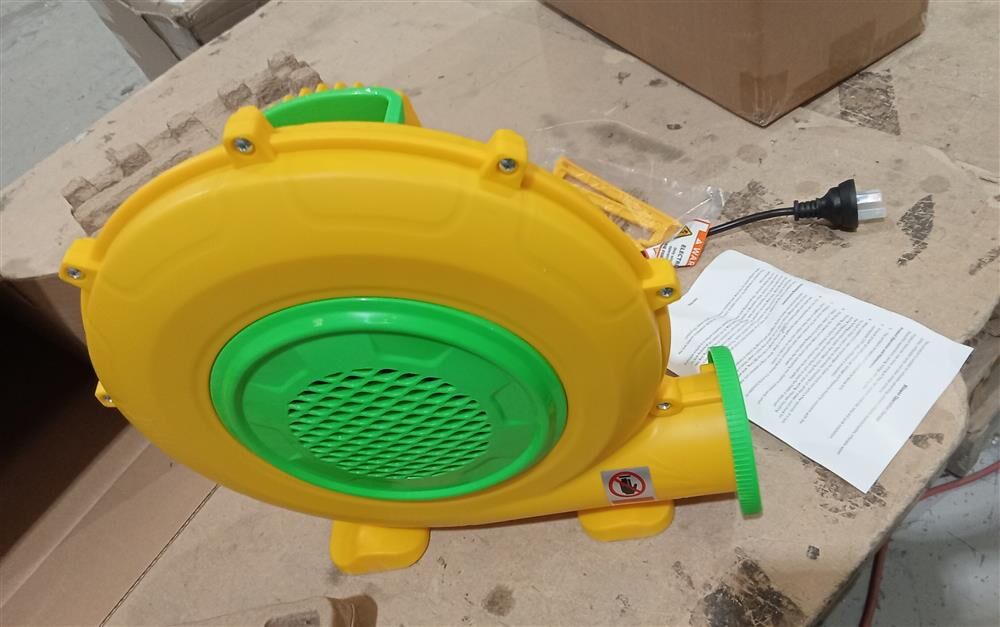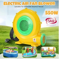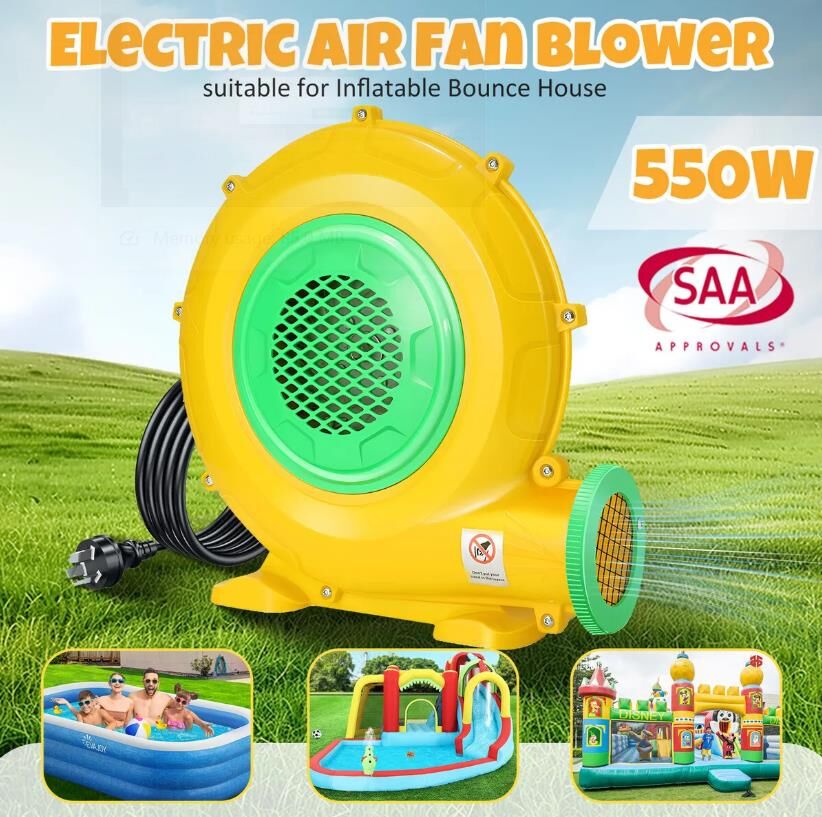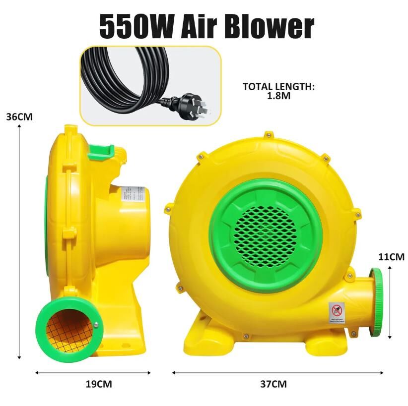 Simplify inflation and enjoy your bounce house in no time with this 550W Electric Air Pump Blower Fan Inflator. Incorporated with durable PP and iron materials, our air blower ensures long-lasting performance and reliability. Compact and portable, the high-pressure air inflator features a convenient top handle, making it easy to transport and store. Further, its small size takes up minimal space for portable operation by a single person. With a powerful 550W motor and an impressive 11cm air outlet diameter, this inflator pump quickly fills and significantly increases airflow. What’s more, it utilises high-quality metal impellers, greatly reducing noise levels during use for a peaceful and enjoyable experience. Safety is prioritised by its clear cover on the switch, wire mesh covering the vents, and unique bearing design. Whether you’re inflating outdoor bounce houses, water slides, obstacle courses, air sofas, or other inflatable bouncers, this versatile blower pump delivers exceptional implementation.