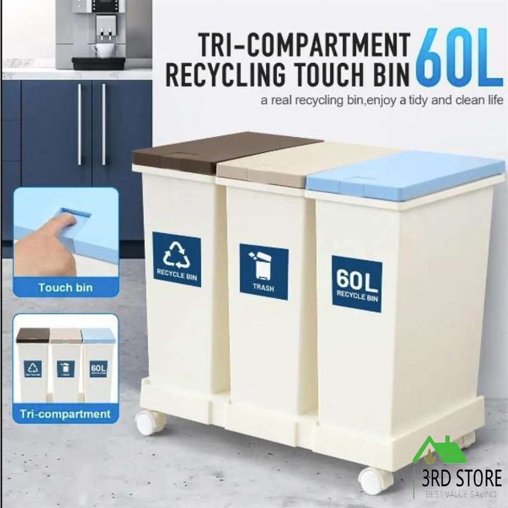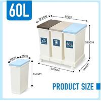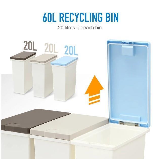 Sort different types of waste easily and encourage recycling with this 60L rubbish trash bin that has three compartments. The eco-friendly and rugged plastic structure contributes to long-lasting durability and optimal safety. A total 60-litre capacity, with each compartment holding up to 20 litres, ensures the unit has plenty of space for your household waste. Besides, the plastic flip-top lid is designed for soft opening and closing with low noise, and the one-click opening mechanism allows for easy operation. Available in a white and easy-to-clean design, our garbage bin is perfect for households of any size. What’s more, the sleek rectangle shape makes this recycling bin flexible enough to fit in any space.