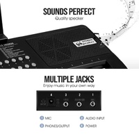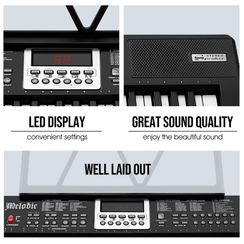 Boost your creativity and hone your musical skills with this 61-key electronic keyboard. Boasting a standard piano keyboard layout and an intuitive LED display, our electronic keyboard invites you to explore a world of sonic possibilities. Immerse yourself in the haven of 100 timbres and 100 rhythms, complemented by 61 keyboard percussions, allowing you to craft intricate melodies and captivating rhythmic patterns. The intelligent teaching function and rhythm programming capabilities empower you to easily improve your skills. while auto chord and chord timbre options unlock new realms of creative expression. Embrace the art of recording and playback, capturing your musical moments precisely. Whether practicing in silence with the headphone jack or amplifying your sound through the speaker output, our standard keyboard adapts to your needs. Our music keyboard is your gateway to musical mastery, coupled with an adjustable stand.