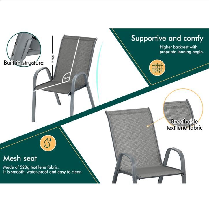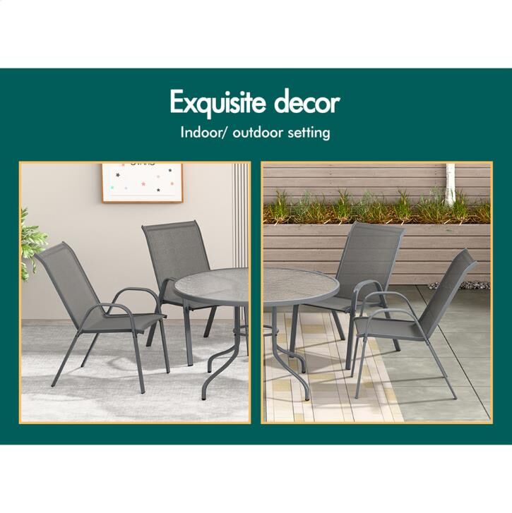 Who wants to host a party indoor whilst the sky is blue outside, or have friends over for coffee in the kitchen whilst the sun shines? Spending time outside in the fresh air not only reduces stress, but also improves our mood and sharpens our focus. With our ALFORDSON® 4x Mesh Outdoor Chairs, it will surely bring comfort and relaxing time to you and your family.