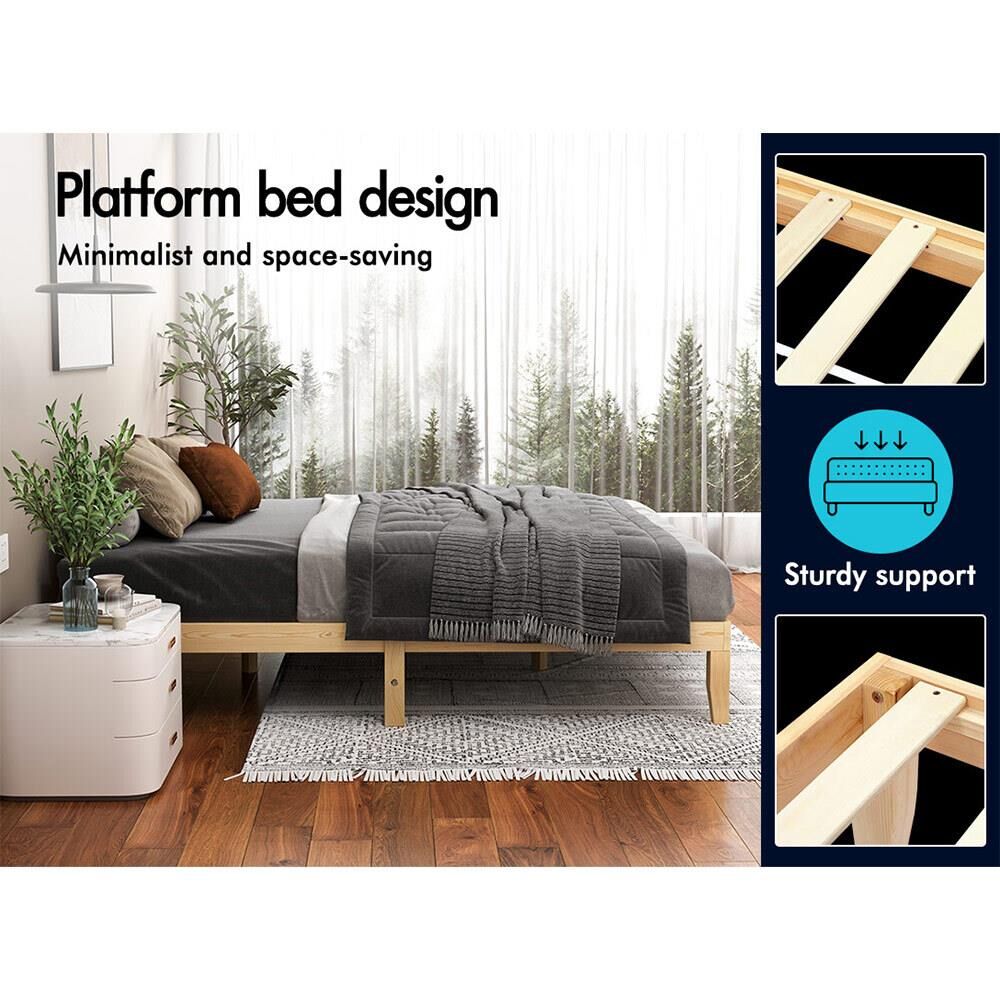 * Colour: Oak* Bed size: Queen* Bed frame material: Pine wood* Slat material: Timber* Weight capacity: 300kg* Size: 203.5cm x 153cm x 31.5cm* Fits Australian queen mattress: 153cm x 203cm* Number of packages: 1