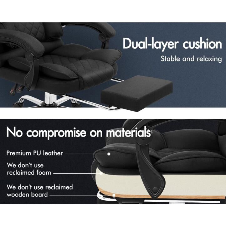 A stylish chrome base with TUV certified casters, Intertek approved linen fabric, SGS approved Gas-Lift system and tilt function, delivering absolute five star luxury. And unlike some other sellers, we have no compromise on materials used. We guarantee that no cycled foams are used, no backrest is cut short or narrow to save money, and no seat foam is cut thin to save cost.