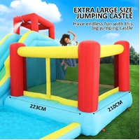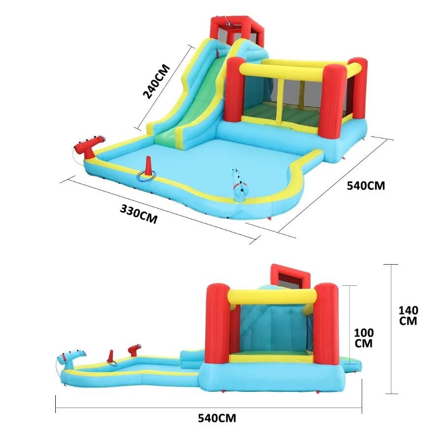 The All In 1 Inflatable Water Park is a playground for family, friends, parties and any water-related themes. It can be your next birthday party theme! The Playground features a large water pool, perfect for kids racing all day long. More fun can be explored with two water cannons, which is the perfect equipment for an exciting water fight. The climbing wall design and the bouncing area in the castle are beneficial for kids developing a strong body. A throwing circle are also included. The flowing water support by a water spraying function helps keep you entertained. The inflatable water park is safe and guarantees a worry-less playtime, using premium Oxford material and stakes to ensure excellent stability and safety. It comes with a carrying bag for convenient storage and an extra repair kit for easy maintenance.