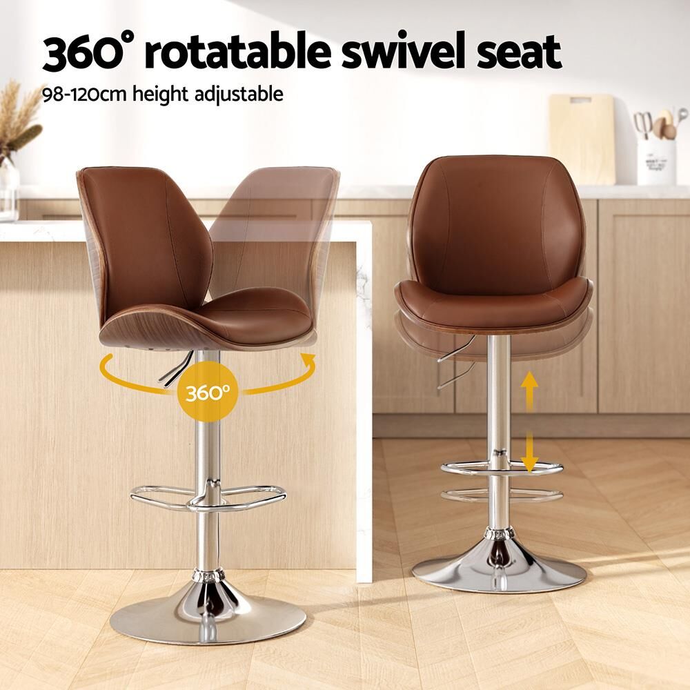 Upgrade your space with Artiss Bar Stools. Featuring tool-free height adjustment (98-120cm), these stools combine premium brown leather seats with elegant bentwood backrests. The reinforced gas lift cylinder and semi-circular footrest ensure stability, while anti-slip protectors safeguard floors. Supports 150kg per stool. Easy assembly for instant use.