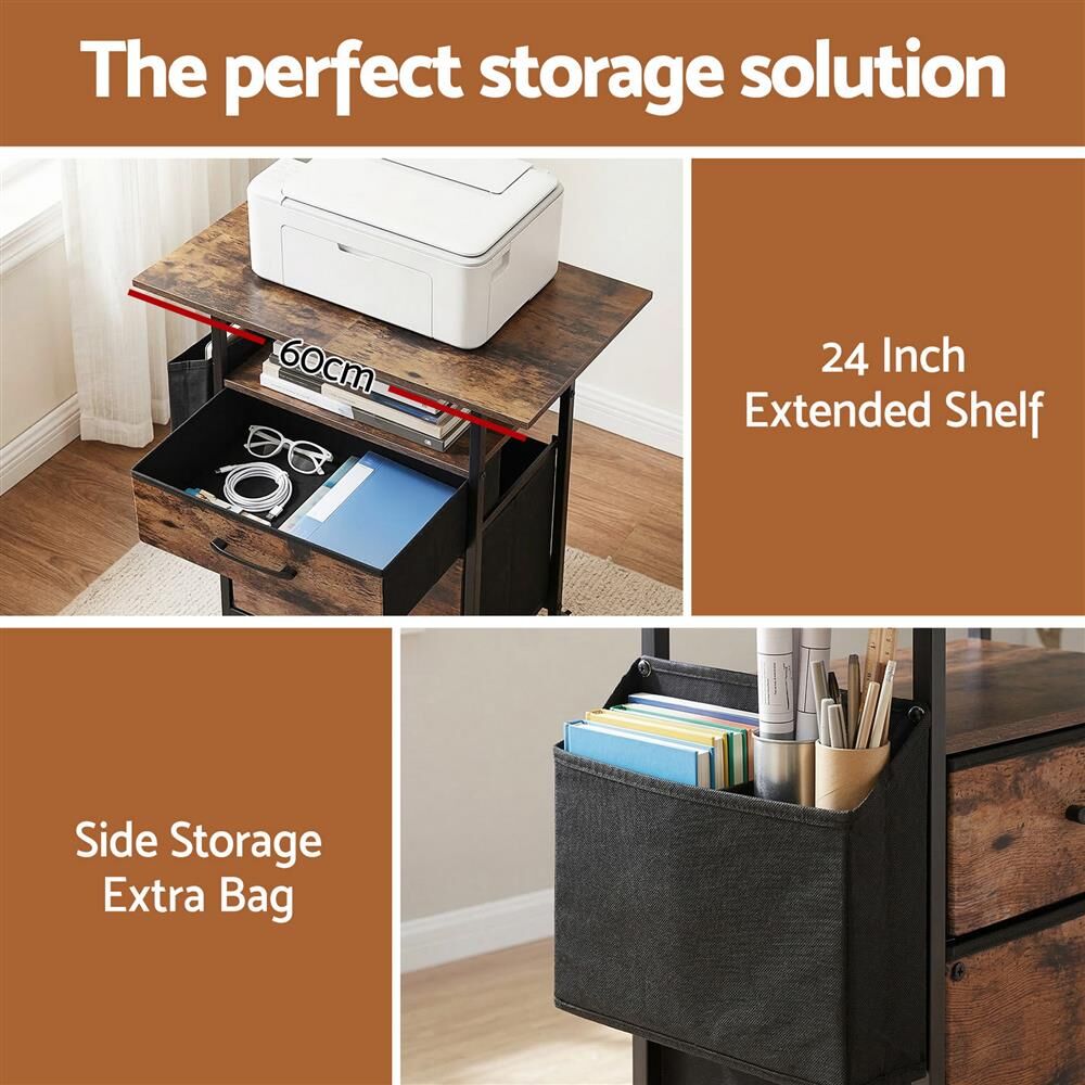 Upgrade your home office with this Artiss Mobile Filing Cabinet. This industrial style file cabinet features a 60cm desktop for your printer, a side bag, and a 2 fabric drawer file cabinet system for A4 files. A versatile rolling file cabinet and printer stand cabinet for any modern workspace.