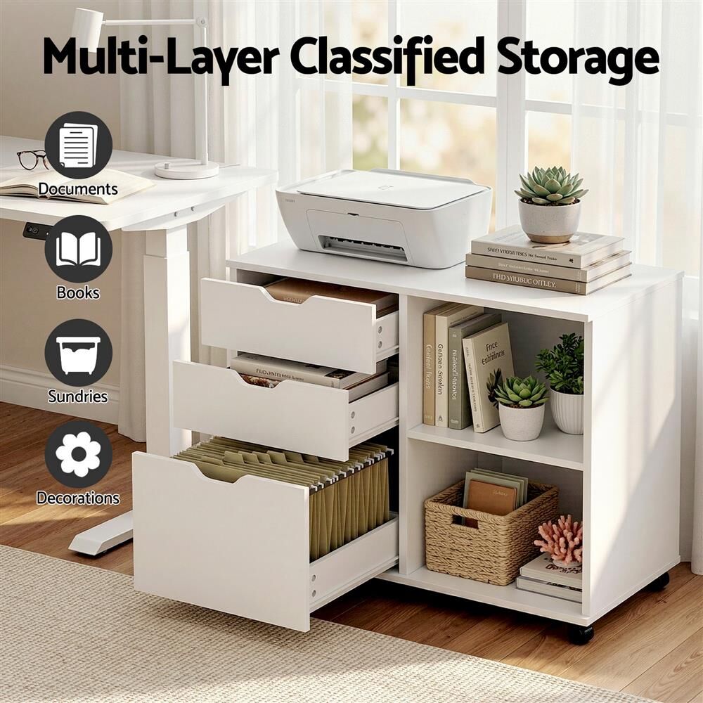 Upgrade your workspace with this Artiss 3 drawer mobile filing cabinet. It doubles as a mobile printer stand cabinet with ample room for A4 files. This filing cabinet features a 5-wheel design for modern storage organization and reliable home office organization.