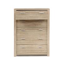 If you find yourself in need of some extra storage space, look no further than our practical and handsome Artiss MAXI 5-drawer Tallboy. With its effortlessly simple and contemporary design, this beauty is crafted from 15mm thick particle board and a delightful, smooth natural woodgrain finish that will easily match your existing home d��cor. It provides plenty of storage space with five generously sized drawers for all your personal essentials. The drawers are easy to open and close thanks to the anti-rust coated metal drawer runners that always ensure smooth operation, and the elegant double handles make it convenient to access the drawers without hassle. Anti-scratch floor protectors fitted at the base of the tallboy keep your floors in pristine condition with every use. Best of all, you can also match with other products from the Maxi series for the complete simple-natural look.