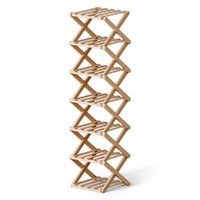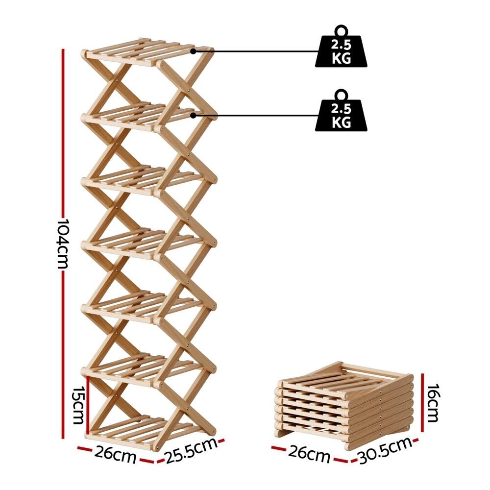 Maximise your space with this elegant Artiss shoe rack! Crafted from sustainable bamboo, this 7-tier organiser provides smart shoe storage for entryways, laundries or garages. The foldable design features a stable X-frame structure, vented panels for airflow, and smooth rounded corners for safety. With no assembly required, it offers instant organisation - each shelf holds 2.5KG. Perfect for rental homes! Compact dimensions: 23.5x25x104cm. Pine finish. 1 package.