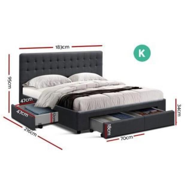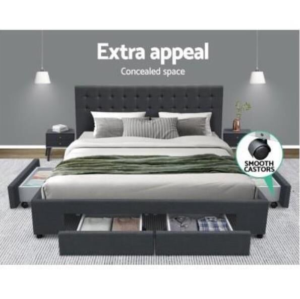 It is time to treat yourself to the bed you deserve. The Artiss Avio bed has it all- beautiful looks, a sturdy strong frame and four large storage drawers so you declutter your bedroom and store your items away in style. You know you will be well supported with a sturdy steel frame that is reinforced with metal bars and heavy-duty connectors. The bed frame is also padded with high density foam and upholstered in a premium faux-linen fabric to really provide you with comfort, and a bed frame that fills you with joy every time you look at it. Note: Mattress is sold separately