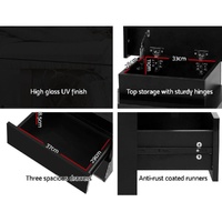 Tired of fumbling in the dark for a light switch in the middle of the night? With our Artiss LED Bedside Table, your problems are solved. The bedside table comes with built-in LED lighting that can be customised into 16 different colours to suit your preference. Not only will it create a beautiful ambience, it will also save you from buying extra bedside lamps or nightlights. Three deep drawers sliding on smooth anti-rust runners provide ample storage space. There is also a top storage compartment that opens with a lift-up lid like a treasure trunk, which you can fittingly fill with your own personal treasures. Better still, the handle-free design gives it a modern vibe that stands out from the mundane. Quality-made with 15mm thick melamine particle board and UV high gloss finish, the bedside table is durable and easy to maintain. And it will be the perfect addition to your modern bedroom with its contemporary and linear design. Or you can keep one in the living room to wow all your houseguests.