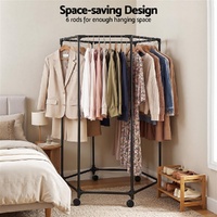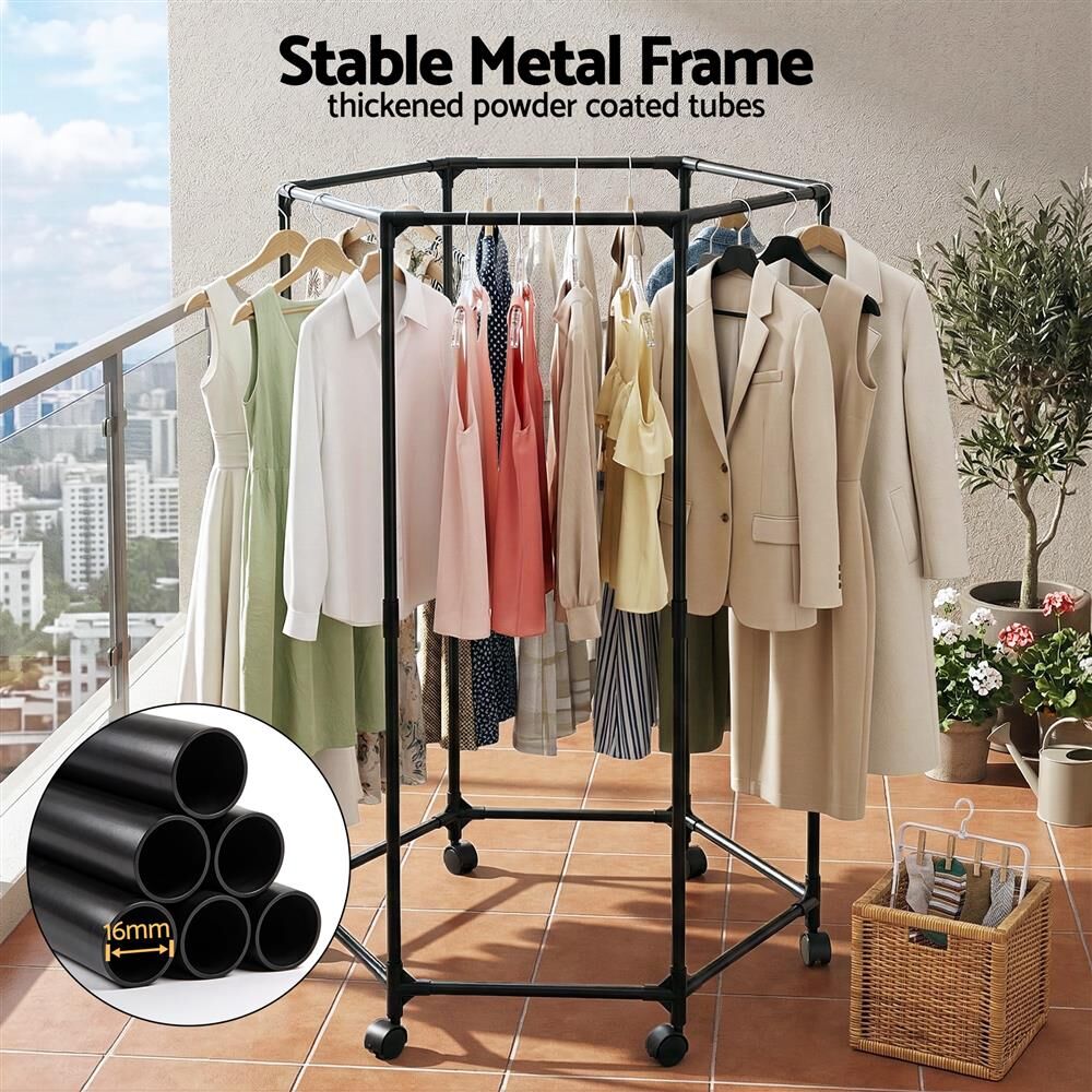 The Artiss clothes rack provides a practical and space efficient drying and storage solution for everyday use. Built with sturdy metal tubes and a unique hexagonal structure, it features six hanging rods for organised garment spacing. Smooth 360 degree swivel casters allow easy movement, while two lockable wheels keep the rack securely in place. Lightweight yet stable, this freestanding clothes rack is easy to assemble and suitable for bedrooms, balconies, laundry rooms, dorms and temporary setups.