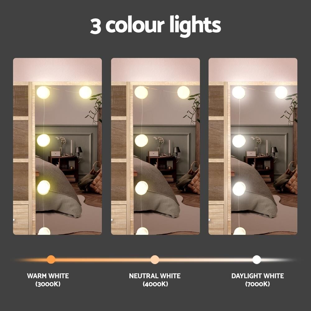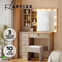 Feel like a star straight out of Hollywood with the Artiss Dressing Table. Packed with generous storage and other convenient features, your new beauty routine will be a breeze. Made from quality MDF particleboard with a melamine finish, the table is built to last. The Hollywood-style makeup mirror is surrounded by bright LED bulbs for the perfect illumination. Choose from warm, neutral and daylight white light so you can always look stage-ready. The vanity features three open shelves that you can use to display trinkets or beauty products. Five generous storage drawers with silver handles open smoothly on anti-rust runners, giving you instant access to your beauty essentials. A foam-padded PU leather stool allows you to sit comfortably while applying make-up or skincare and can be neatly tucked away when not in use. Easy to install and even easier to maintain, you'll love getting ready for the day in front of your new Artiss Dressing Table.