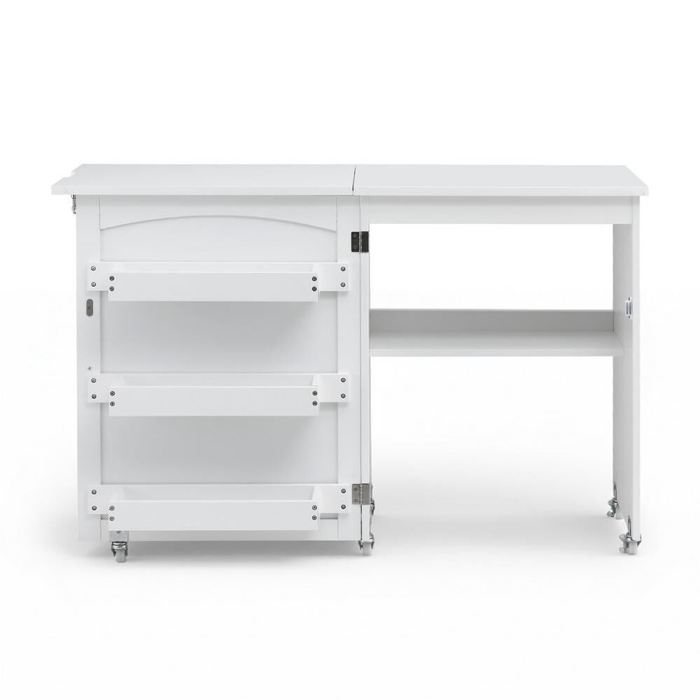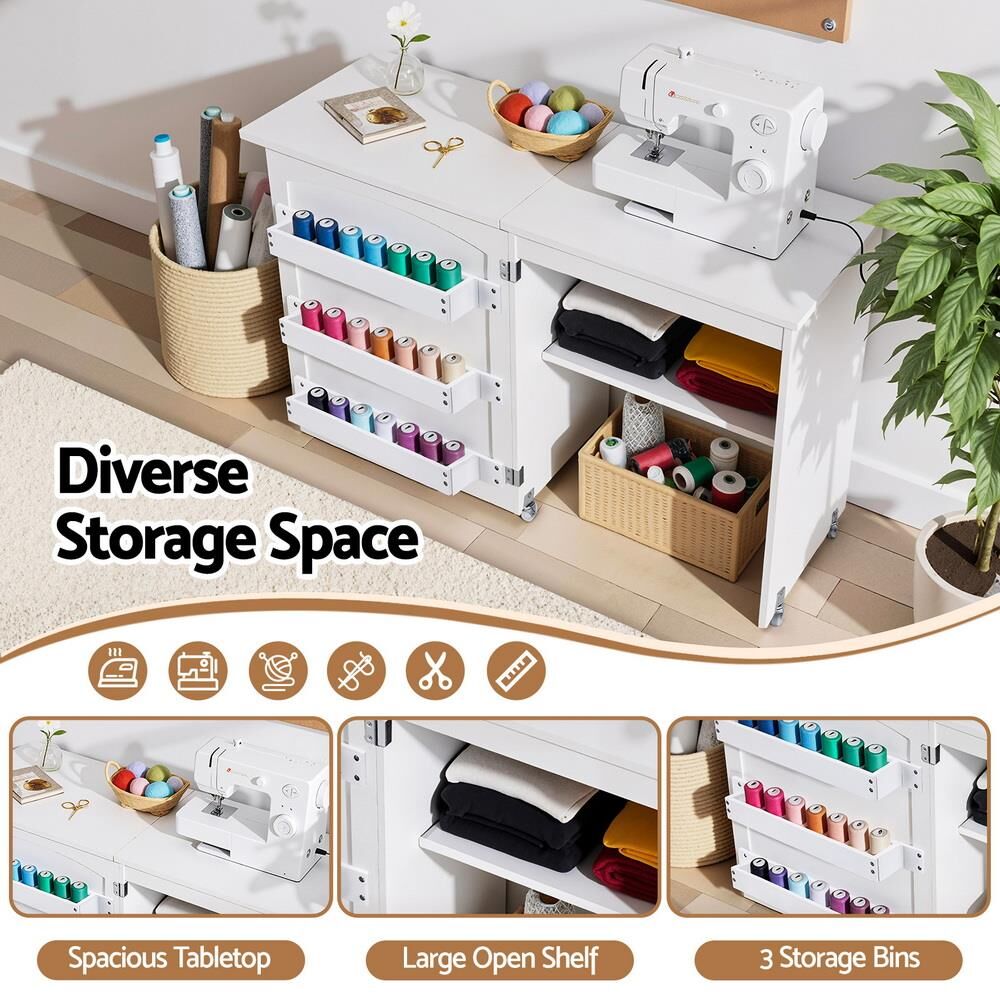 Revolutionize your creative space with this versatile folding sewing and craft table. Designed to be a compact solution for any home, it effortlessly folds out to reveal a spacious work surface and ample storage, including three storage bins and a shelf. Its five smooth-rolling wheels allow you to move your entire workstation anywhere you need, making it an ideal, multi-functional addition to your home for all your crafting, sewing, office or any other needs.