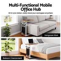 Upgrade your workspace with our adjustable mobile laptop desk combines professional functionality with home comfort. Designed for modern work-from-anywhere lifestyles. This lightweight yet sturdy workstation features smooth-rolling castor wheels, allowing you to effortlessly move it between your bed, couch, or favorite recliner.This versatile workstation features a pneumatic height adjustment system that lets you easily customize your desk in different height with just one hand - perfect for both sitting and standing positions.Crafted with a sturdy C-shaped metal frame, our desk provides exceptional stability while supporting up to 10kg on its spacious surface, which offers a durable and stylish workspace for your laptop, tablet, or paperwork.