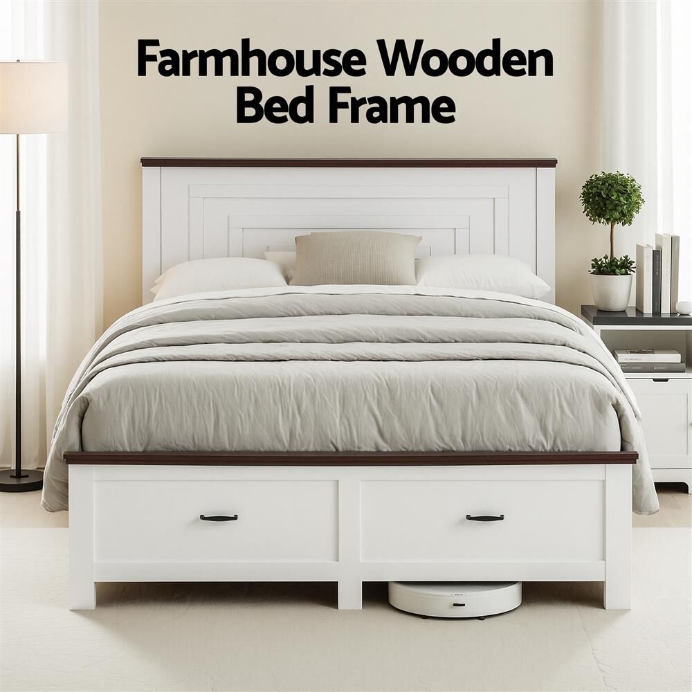 Fashionable Modern Style: Our platform bed frame boasts a refined finish that exudes farmhouse elegance. This stunning white bed design enhances your bedroom set furniture while providing the quality needed for a perfect sleep experience. Whether you prefer a vintage bed frame, a rustic bed frame, or a farmhouse bed frame, this bedframe fits perfectly with farmhouse living room furniture and white farmhouse dresser aesthetics.