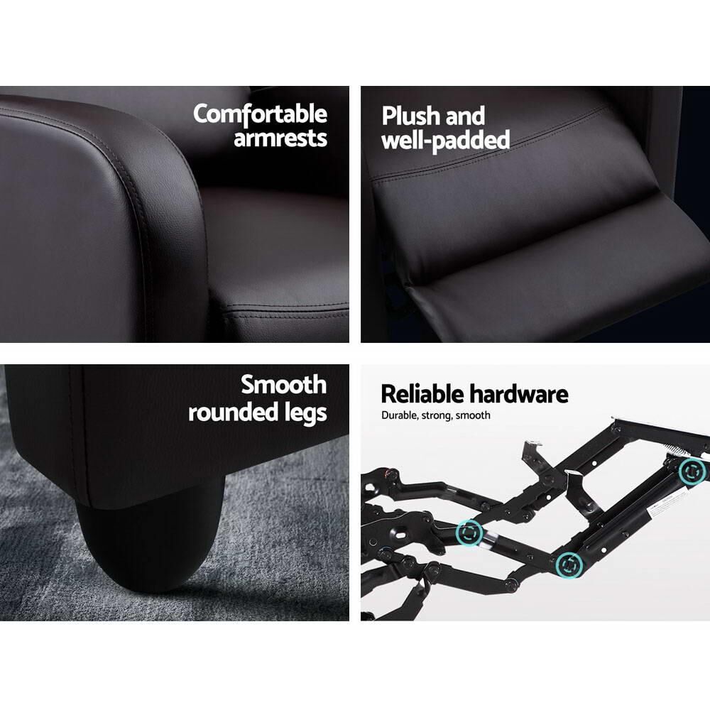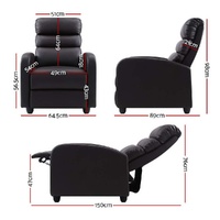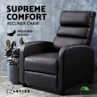 Enjoy the gold class movie experience in your own home with our Artiss Recliner Chair. Richly padded in high-resilience foam and upholstered in smooth and luxurious PU leather, the chair certainly looks like it belongs in gold class. In the upright position, the recliner is a comfortable armchair where you can sit for long chats with guests. Or you can easily adjust the backrest and footrest to recline to your preferred angle. The backrest has three padded zones for full head and back support so that no matter the tilt, you have total body comfort. The chair is suitable in any room with its classic design. Keep it in your study to be perfectly rested during your work breaks. In the living room for watching television or listening to music. Or keep several in the media room for the complete cinema experience. Wherever you decide to put it, you can always sit back and relax on our recliner chair.