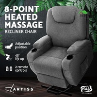 Say goodbye to stiff muscles, back aches, sore necks, tense legs and general lethargy each time you have a seat in our ever-helpful and marvellous Artiss Recliner Chair. With its 8-point heated massage, you can enjoy great massages all over your body that feel just like ones from real masseurs, but in the comfort of your own home. The backrest is adjustable as is the footrest so that you can get into your desired position for a truly relaxing and soothing massage. But great massages are just half the story. Upholstered in premium faux linen fabric, the recliner chair is also a plush recliner, complete with luxurious padded seating, four handy storage pockets and two cup holders. Better still, it has a lifting mechanism to assist you in getting up from your chair with minimum hassle and even two wheels so that you can easily move the chair to enjoy massages wherever you prefer. Watch TV or enjoy the scenic outdoors, our classic design recliner chair is there at your service in more ways than one.