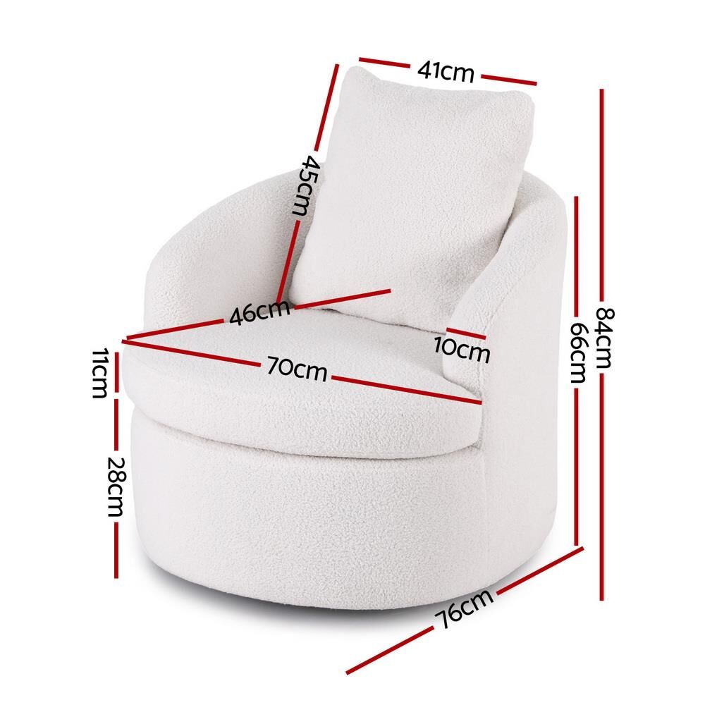 Upgrade your home with this Artiss versatile swivel armchair, designed for both comfort and style. The smooth 360-degree swivel feature allows you to effortlessly turn and face any direction, making it convenient for conversations, watching TV, or simply relaxing.Featuring a Sherpa fleece, ergonomically curved armrest, it offers the perfect blend of luxury and support. The sturdy plywood frame and metal base ensures long-lasting durability. With a weight capacity of 150kg and easy assembly to tighten base, this chair is ideal for any living room, bedroom, or office.