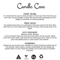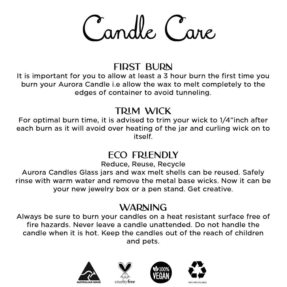 - Keep these care instructions handy and enjoy your Aurora candles and don't forget to come back and try more Aurora fragrances as we are continuously adding more all the time.