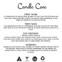 - Keep these care instructions handy and enjoy your Aurora candles and don't forget to come back and try more Aurora fragrances as we are continuously adding more all the time.