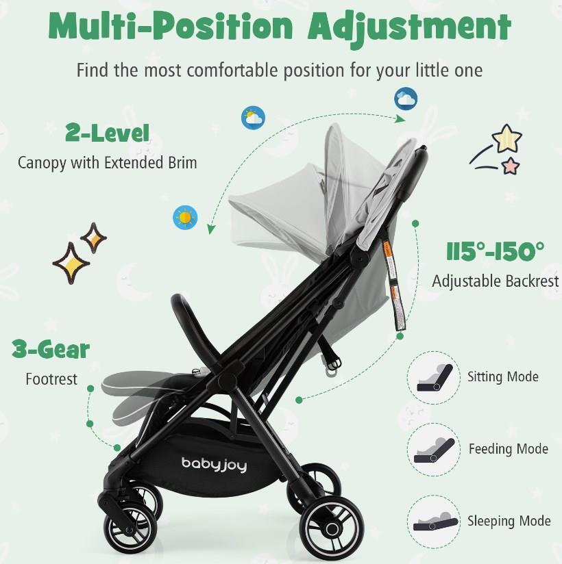 - 2-level adjustable canopy protects baby from heavy sunlight