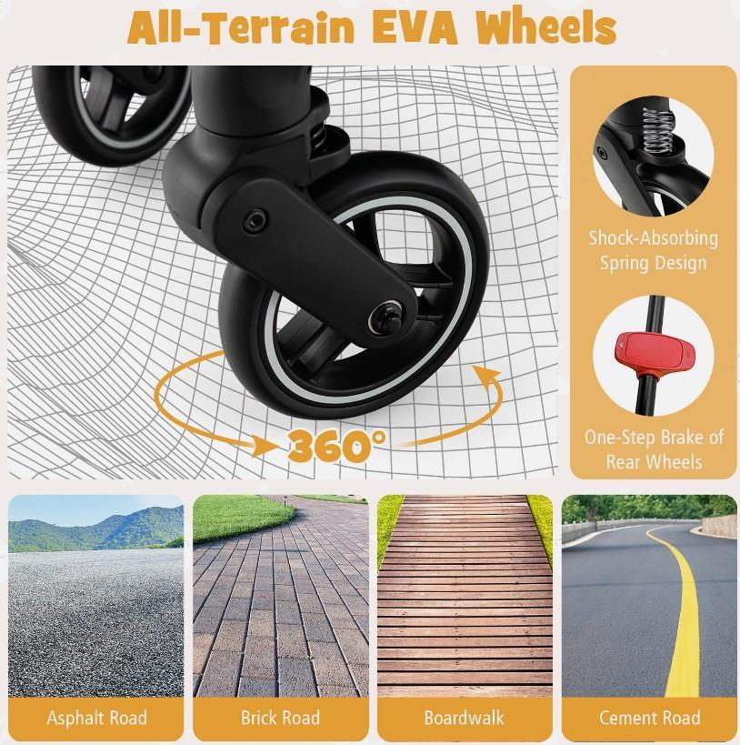 - 2 front wheels are universal and designed with shock-absorbing springs