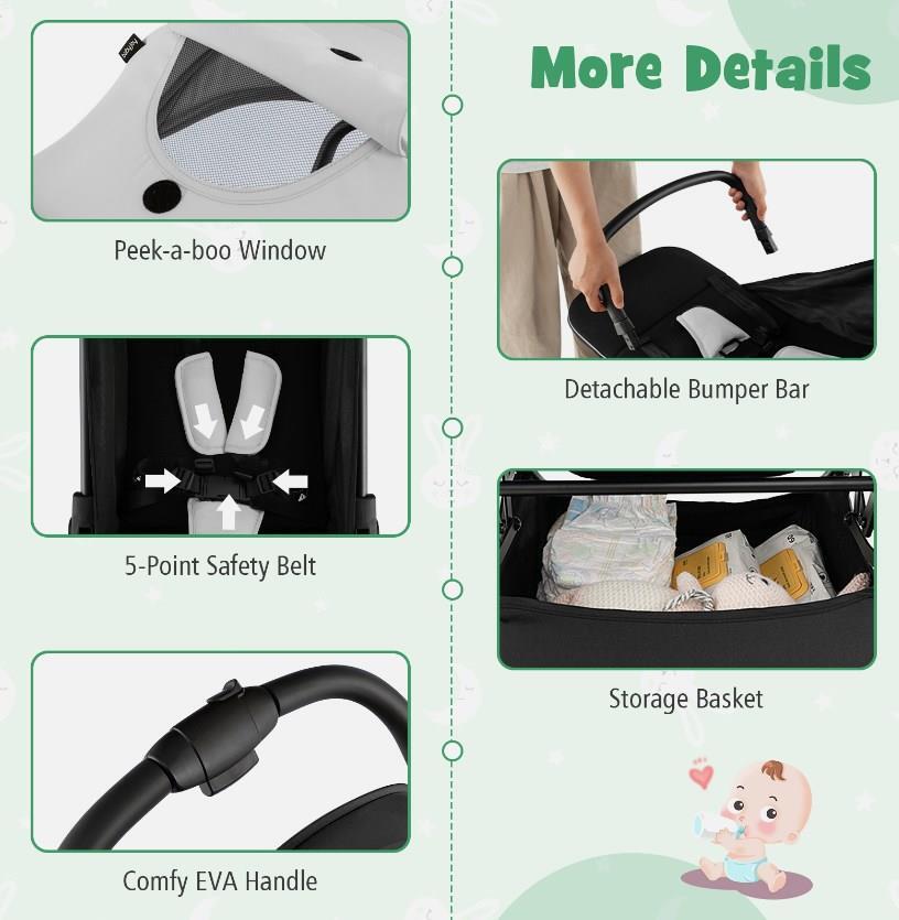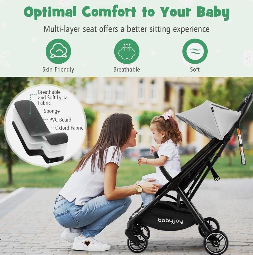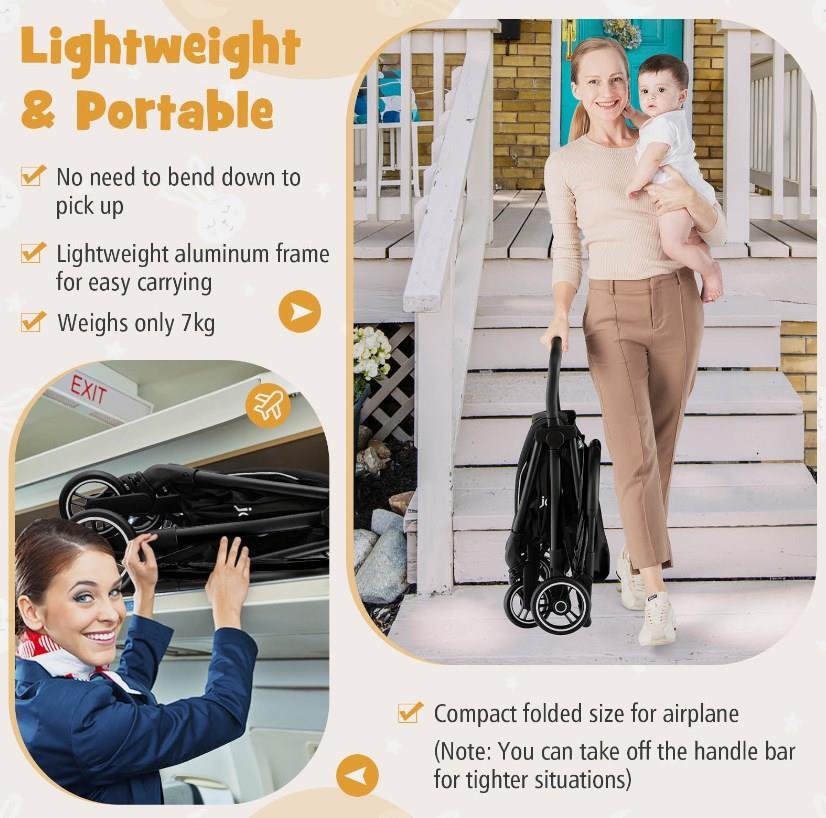 Supported by heavy-duty aluminum frame, the baby stroller is sturdy and durable for the long run. It's lightweight with 7 kg, so that you can carry the stroller anywhere effortlessly. What's more, the baby stroller can be folded in seconds with the folding button, which doesn't need parents to bend down due to the gravity folding design. And it can stand stably even in the folding state. The stroller also perfectly keeps your little one safe and comfortable. A one-step rear wheel brake is designed for better and safer control and 5-point safety belt always keeps your baby in the right place. What's more, the comfy seat with adjustable backrest and footrest gives your baby endless comfort. With the large canopy, you needn't worry that your baby will be hurt by the sun. The baby stroller also features universal front wheels and smooth rear wheels for stable movement. If you are looking for a baby stroller, this portable stroller will be an awesome choice.