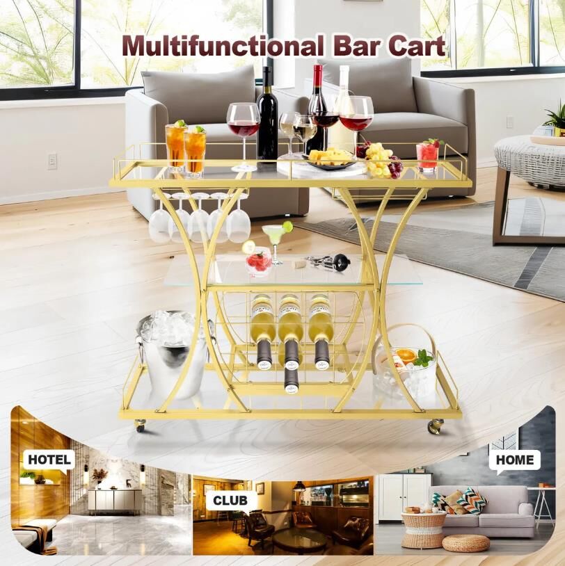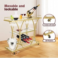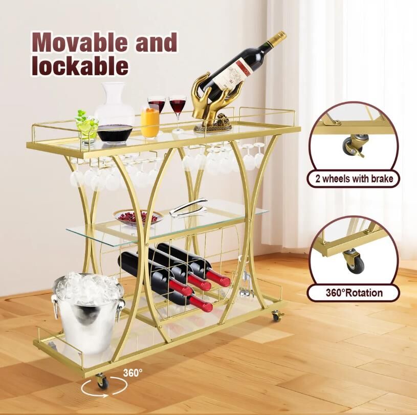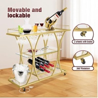 Make hosting at home easier with this Gold Bar Trolley Cart Drinks Serving Shelves. The bar trolley cart is a stylish and functional addition to any space. It includes a wine rack and stemware holder that hold up to 12 goblets and 9 wine bottles. There's also a glass shelf perfect for displaying tableware, plants, snacks, and fruit baskets. Built with durable tempered glass and a metal frame with a gold finish, this cart is designed to last. A protective guardrail helps keep your items secure, while the 360-degree swivel wheels make it easy to move around. Plus, two wheels can be locked to keep it in place. The elegant design of the trolley effortlessly complements any interior decor. Assembly is a breeze with all the necessary hardware and detailed instructions included.
