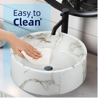 Enhance the elegance and sophistication of your bathroom with this White Round Vessel Sink Basin. With its contemporary design, this sink can serve as a standalone piece or be paired with a vanity for a complete bathroom aesthetic. Its high-quality, durable ceramic construction guarantees longevity and maintains its pristine appearance even with regular use. The smooth, non-porous surface allows for easy cleaning and maintenance. Additionally, the centrally located drain is compatible with any standard-sized drain system, ensuring efficient water drainage. The countertop design facilitates quick and easy installation, making it a perfect choice for smaller bathrooms or powder rooms.