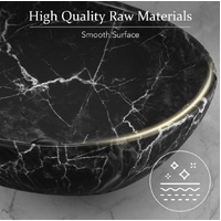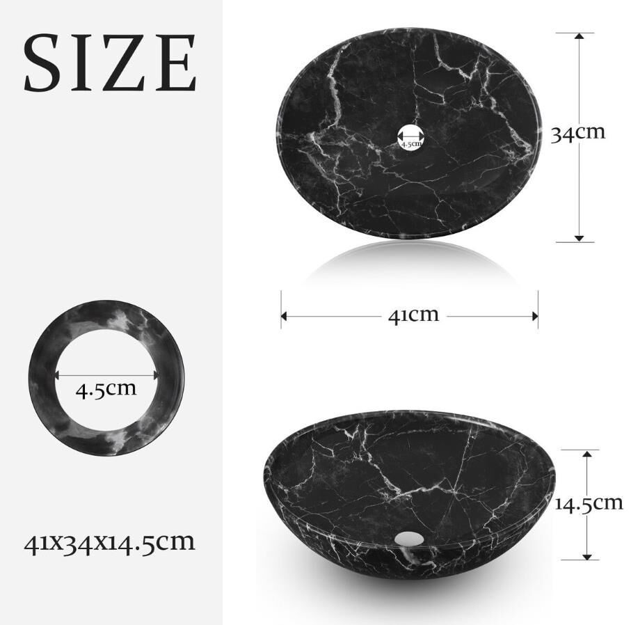 Make your bathroom modern and luxurious with this black bathroom sink. Boasting a stylish oval design, this vessel sink is produced from premium ceramic and features a non-porous, glossy, baked-on finish that ensures lasting durability and scratch resistance. Its elegant aesthetics are complemented by practicality, as the sink is easy to clean and maintain. Quick and simple to install, the bathroom basin features a centre drain that enhances water drainage efficiency. Furthermore, its design optimises storage space and seamlessly integrates with any bathroom decor, making it a perfect addition to your modern bathroom.
