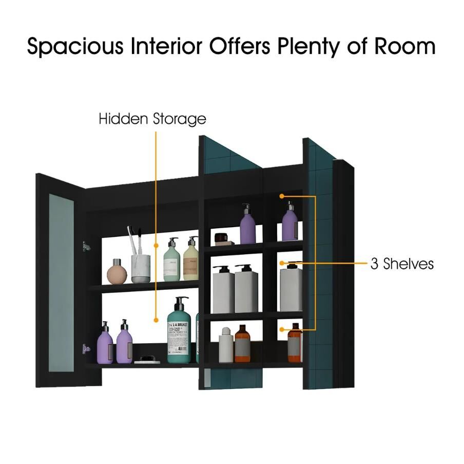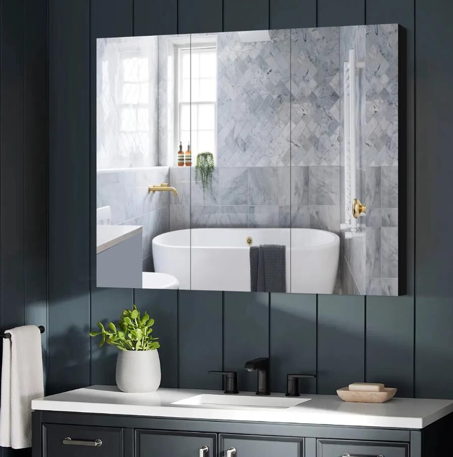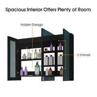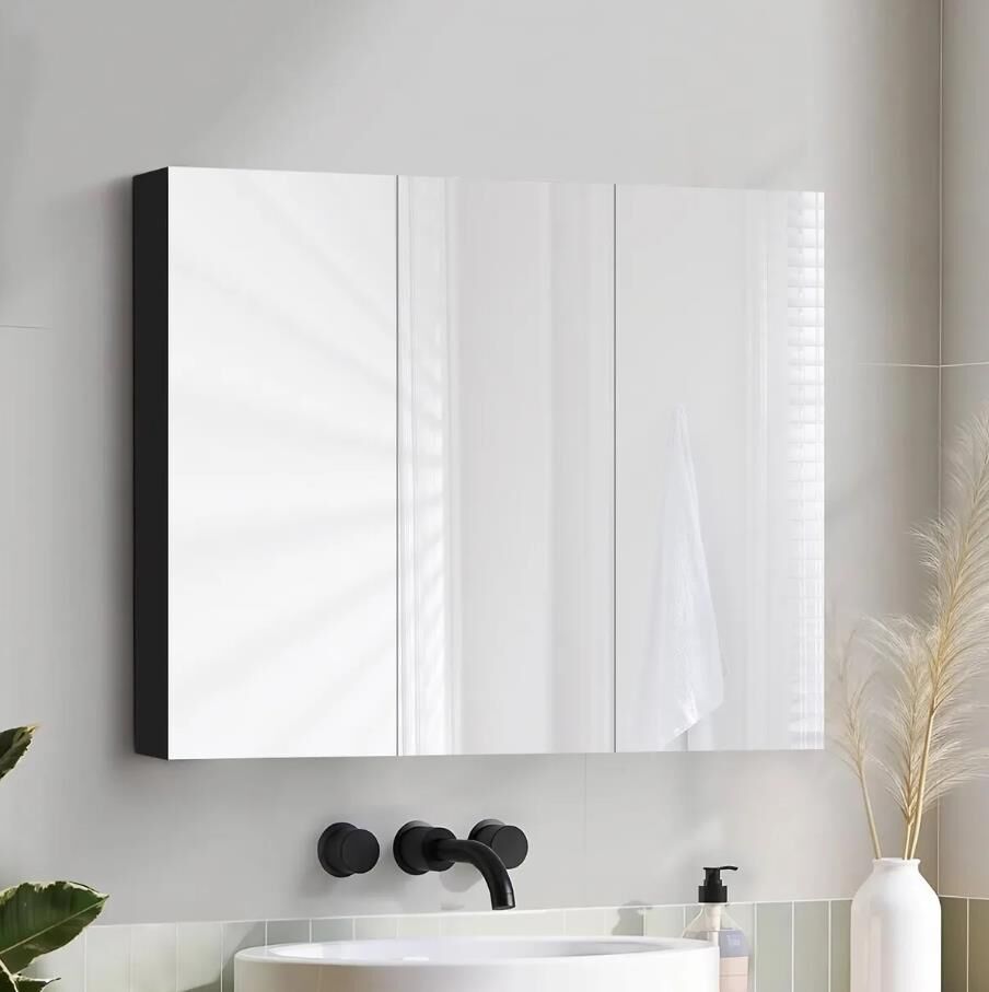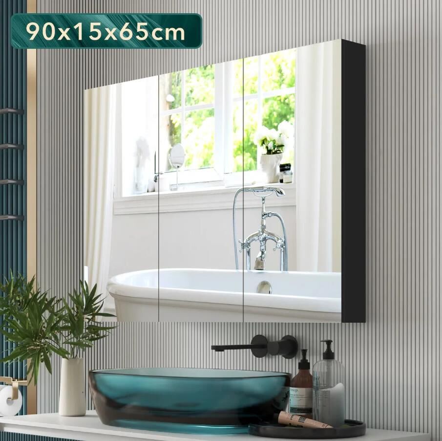 Create a clutter-free bathroom environment with this bathroom mirror cabinet medicine shaving storage organiser. Featuring three high-definition mirror doors, this mirror cabinet offers crystal-clear reflections, enhancing your grooming and hairstyling routine. Constructed with a robust and non irritating PB structure, it delivers exceptional safety, sturdiness and long lasting durability. Organise your toiletries and bathroom essentials neatly on its two large shelves and three small compartments, making it easy to access your daily items. Designed for effortless setup, this shaving cabinet is also simple to clean and maintain. This modern storage cabinet complements any bathroom décor, adding an elegant touch to your space.